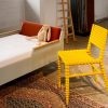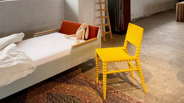 De afmetingen van het bed zijn 220 x 98 x 65 cm (l x b x h) en het bed is gemaakt van berkenmultiplex en stoffen van Kvadrat.